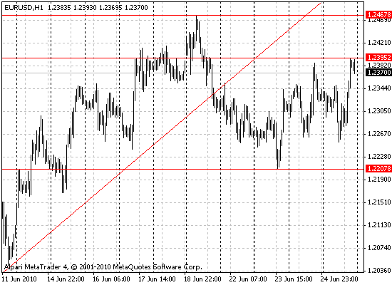 Рост инвесторских настроений, который нарастал всю предыдущую неделю и создавал хорошую бычью волну по евро на протяжении всех пяти дней с 11 по 18 июня, продолжился и в начале прошедшей недели. Понедельник открылся ростом евро, при этом европейская валюта протестировала новый месячный максимум – ценовой уровень – 1,247 долларов за евро.
