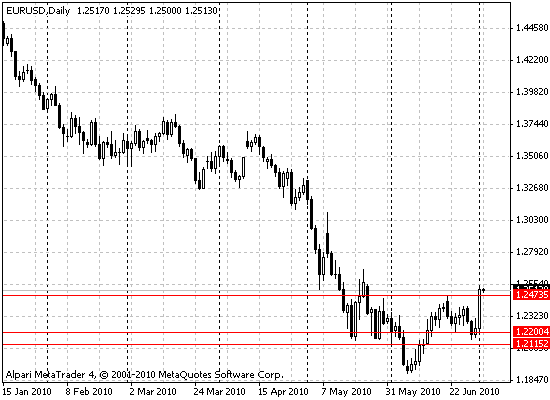 Вчерашние весьма негативные данные по США, усилили опасения инвесторов относительно того, что восстановление экономики США серьезно замедляется. На этом фоне инвесторы активно продавали доллар против всех валют, особенно против евро. Европейская валюта в течении одного дня практически отыграла потери последних 15 дней и вновь вышла на двухмесячный максимум цены – 1,247 долларов за евро.