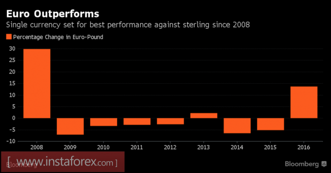 Согласно опросу Financial Times, рост ВВП Британии замедлится с 2% в 2016-м до 1,3% в 2017 году. В 2015 году экономика выросла на 2,2%. В данном случае используется медианная оценка, а диапазон мнений достаточно широк: от 0,6% до 2,7%. Приблизительно то же самое имеет место при оценке перспектив инфляции. Средний прогноз предполагает, что потребительские цены ускорятся с 0,7% до 2,5%, а наиболее пессимистично настроенные эксперты ожидают стагфляции и CPI на уровне +3,5%. Любопытно, что прогнозы по ВВП и инфляции в еврозоне составляют 1,47% и 1,26%. Первая цифра говорит о том, что европейская экономика будет чувствовать себя лучше, чем британская, что создает предпосылки для покупок EUR/GBP.