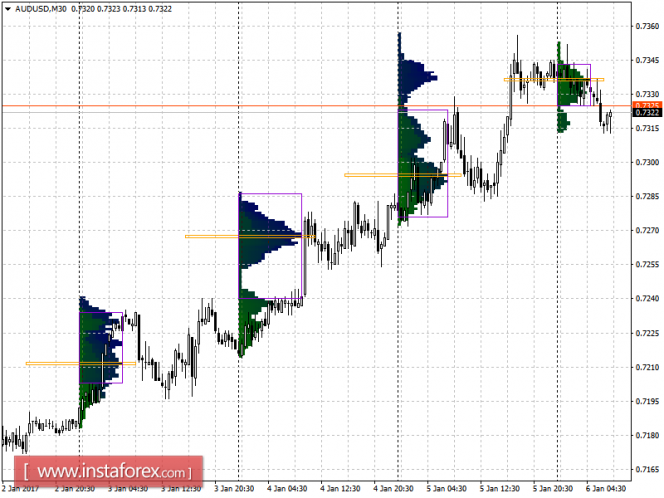 Пробой и закрепление ниже VAH от 5 января – 0.7323 может привести к возврату под уровень POC этого же дня – 0.7295, откуда медведи пойдут на контратаку и обвалят AUD/USD уже в район вчерашних целей в области 0.7256 и POC от 3 января – 0.7211. Самой дальней целью по коротким позициям на конец недели послужит уровень POC от 27 декабря – 0.7187.