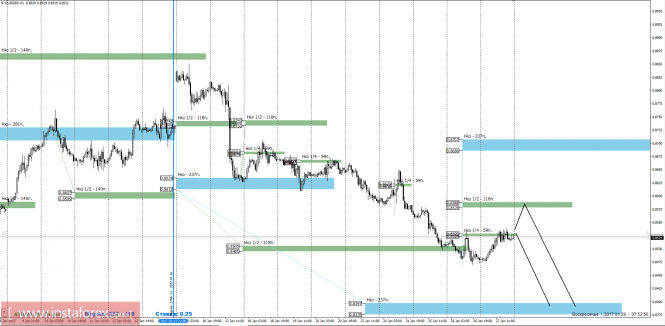 Пара формирует нисходящую модель, где минимум недели является ближайшей целью, которая будет достигнута с вероятностью 70%. Дальнейшее снижение будет зависеть от реакции на месячную КЗ января 0.8440-0.8400. Вероятность появления крупного спроса при тесте зоны высока, поэтому формирование зоны накопления среднесрочного порядка является основной моделью, которую необходимо учитывать при построении торгового плана. Фиксация коротких сделок при тесте месячной КЗ является оптимальной стратегией.