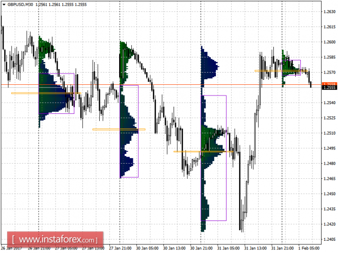 У продавцов фунта могут возникнуть проблемы уже в районе POC от 27 января – 1.2549. Пробой этого уровня приведет к более крупной нисходящей коррекции к POC от 30 января – 1.2513, а затем и к POC от 31 января – 1.2492. Самой дальней целью выступят минимумы в области VAL от 24 января – 1.2471 и POC от 23 января – 1.2452.
