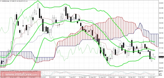 В целом текущий рост пары usdrur не нарушает масштабный южный тренд при одном условии – если пара не преодолеет важный уровень сопротивления – 57.60 (средняя линия Bollinger Bands и пересечение линий Tenkan-sen и Kijun-sen на дневном графике). В таком случае индикатор Ichimoku Kinko Hyo сформирует сигнал «Золотой крест», который будет говорить о смене тренда на северный. А пока что данный индикатор продолжает демонстрировать медвежий сигнал «Парад линий». Приоритет южного направления также подтверждается расположением цены между средней и нижней линиями индикатора Bollinger Bands, который находится в сужающемся канале. Осцилляторы MACD и Stochastic указывают на перепроданность пары, что в свою очередь указывает на нисходящее движение. Уровнем поддержки является минимум июня – отметка 56.79.