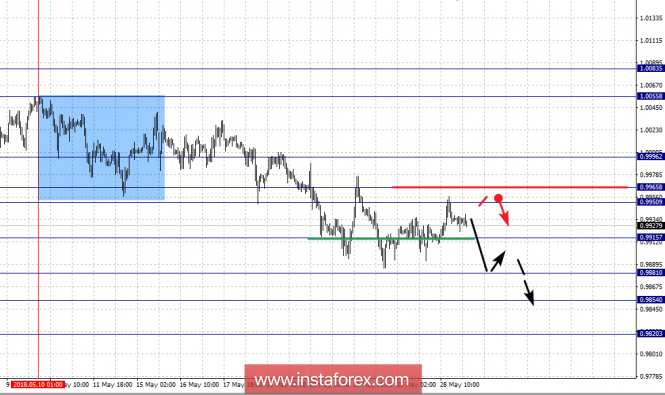 По паре Доллар/Франк ключевыми уровня в масштабе Н1 являются: 0.9996, 0.9965, 0.9950, 0.9915, 0.9881, 0.9854 и 0.9820. Здесь, мы продолжаем следить за нисходящим циклом от 10 мая, на текущий момент цена находится в коррекции. Продолжения движения к низу, ожидаем после пробоя 0.9915, в данном случае цель – 0.9881, в коридоре 0.9881 – 0.9854 краткосрочное нисходящее движение, а также консолидация. Потенциальным значением для низа, считаем уровень 0.9820, по достижении которого, ожидаем откат к верху.