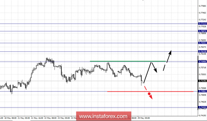 По паре Австралийский доллар/Доллар ключевыми уровнями в масштабе Н1 являются: 0.7711, 0.7687, 0.7650, 0.7622, 0.7590, 0.7496 и 0.7445. Здесь, цена близка к отмене восходящей структуры от 15 мая, для чего необходим пробой уровня 0.7496, в данном случае потенциальная цель для нисходящего движения – 0.7445. Продолжения движения к верху, ожидаем после пробоя 0.7590, здесь цель – 0.7622, в коридоре 0.7622 – 0.7650 краткосрочное восходящее движение, а также консолидация. Пробой уровня 0.7650 должен сопровождаться выраженным восходящим движением, здесь цель – 0.7687. Потенциальным значением для верха, считаем уровень 0.7711.