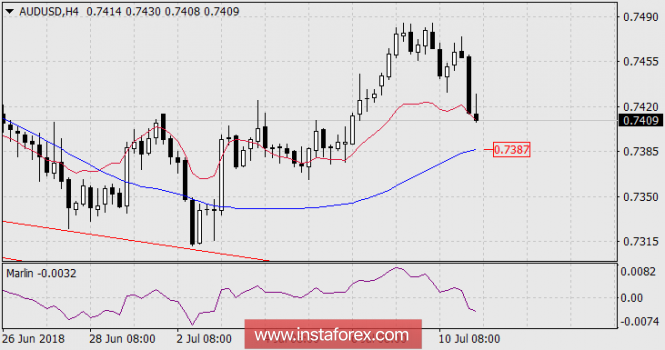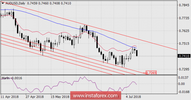 На дневном графике сигнальная линия осциллятиора Марлин переместилась в отрицательную зону чисел, что после разворота цены от трендовой линии Крузенштерна указывает на сформировавшийся сигнал к дальнейшему снижению. Целью выступает поддержка трендовой линии на 0.7265.