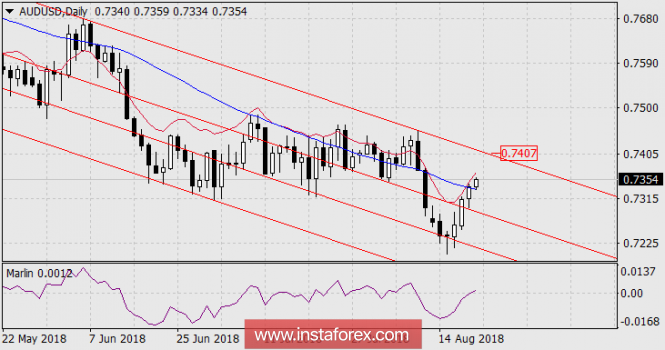 При втором варианте цена, пользуясь поддержкой Крузенштерна, сразу направится к намеченной цели (0.7407). Как развитие первого и второго вариантов возможно преодоление верхней границы ценового канала, что повлечёт за собой полную графическую перестройку, и, конечно, может быть разворот цены с движением к пятидневному минимуму. Ситуация не торговая, ждём развития событий.