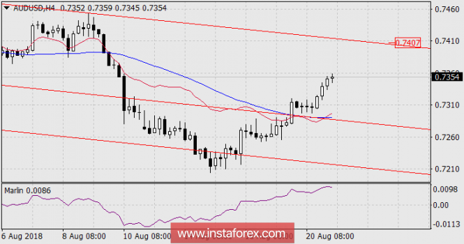 За понедельник и азиатскую сессию вторника австралийскому доллару удалось закрепиться над трендовой линией Крузенштерна. Цена устремляется к верхней границе ценового канала, но ей в этом намерении мешает три фактора: балансная красная линия, осциллятор Марлин, разворачивающийся вниз от границы с территорией роста, дивергенции цены с осциллятором на младших таймфреймах. Да и само закрепление цены над линией Крузенштерна пока формально, так как день только начался и цена ещё может уйти под эту линию.