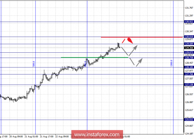 Краткосрочное восходящее движение, возможно в коридоре 1.3033 – 1.3053, пробой последнего значения приведет к углубленной коррекции, здесь цель – 1.3082, этот уровень является ключевой поддержкой для нисходящей структуры от 24 августа, его проход ценой будет располагать к развитию восходящей структуры от 22 августа.