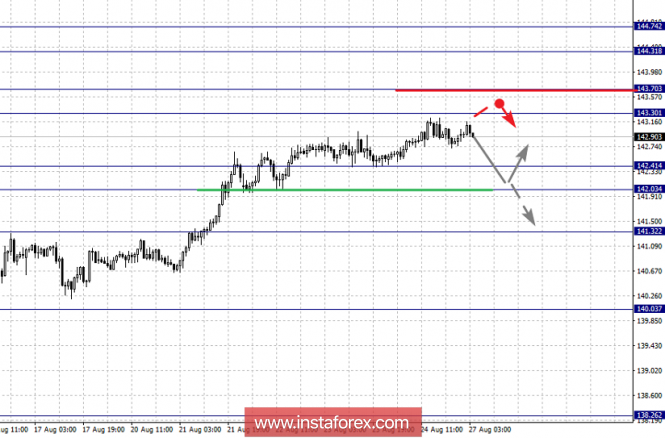 Краткосрочное нисходящее движение, возможно в коридоре 142.41 – 142.03, пробой последнего значения приведет к углубленной коррекции, здесь цель – 141.32, этот уровень является ключевой поддержкой для верха.