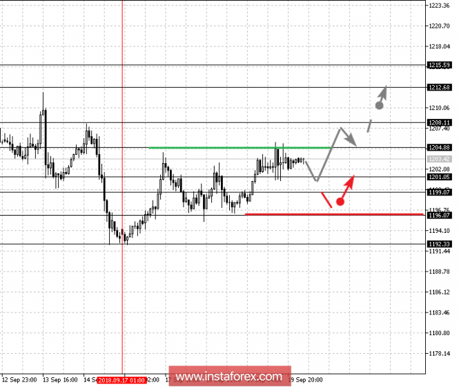 Краткосрочное нисходящее движение возможно в коридоре 1201.05 – 1199.07, пробой последнего значения приведет к углубленной коррекции, здесь цель – 1196.07, этот уровень является ключевой поддержкой для верха.