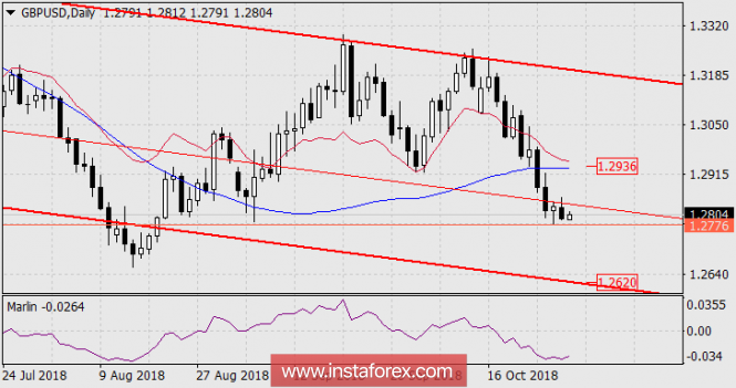 Выход цены над сопротивление трендовой линии ценового канала (выше максимума вчерашнего дня) позволит цене прорваться к сопротивлению трендовой индикаторной линии Крузенштерна на дневном масштабе (1.2936). Уровень сильный – минимум 3 октября и максимум 22 августа (примерно). От него ждём разворот к 1.2620. К такому сценарию располагают ожидания по сегодняшним данным; баланс розничных продаж в Великобритании от CBI за октябрь ожидается ростом с 23 до 27, индекс потребительского доверия в США от Conference Board за октябрь ожидается понижением с 138,4 до 136,3. В целом же ситуация остаётся более «медвежьей».