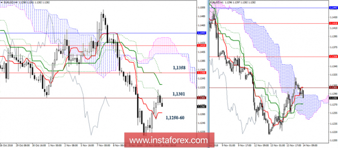 В настоящий момент мы наблюдаем развитие восходящей коррекции. Действующая зона сопротивлений объединяет некоторые значимые рубежи – Фибо Киджун Н4 (1,1304), облако Н1 (1,1292), исторический уровень (1,1301). Преодоление позволит рассматривать следующие повышательные ориентиры – цель на пробой облака Н1, тестирование заключительных рубежей мёртвого креста Н4, подъём к дневному Тенкану (1,1358). Среди поддержек сейчас можно отметить район 1,1260-50 (Тенкан Н4 + крест Н1 + низ облака Н1).