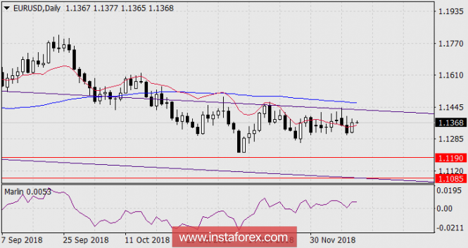 В среду под влиянием роста британского фунта и информации о готовности Италии ограничить бюджет дефицитом в 2%, евро подрос на 50 пунктов. Цена вновь оказалась выше линии баланса дневного таймфрейма. На четырёхчасовом графике цене удалось даже закрепиться над линией Крузенштерна. Слабость сигнала в том, что формальное закрепление цены над линией произошло только сегодня в азиатскую сессию при низкой волатильности. Сегодня ЕЦБ оглашает решение по монетарной политике, в 16:30 мск выступает глава ЕЦБ Марио Драги. Инвесторы ждут новой информации регулятора о планах регулятора на будущий год. Но если Драги не внесёт конкретики, что и ожидается рядом банков и агентств, евро может легко упасть.
