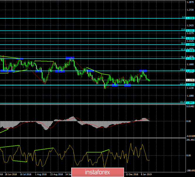 Пара EUR/USD, несмотря на образование двух бычьих дивергенций, все-таки выполнила падение к уровню коррекции 23,6% - 1,1358. Отбой котировок от этого уровня позволит трейдерам ожидать разворот в пользу европейской валюты и некоторый рост в направлении коррекционного уровня 38,2% - 1,1446. Новых назревающих дивергенций 21 января не наблюдается. Закрытие пары под уровнем Фибо 23,6% сработает в пользу продолжения падения в направлении следующего уровня 1,1269.