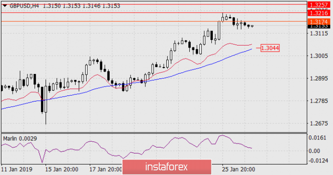 В ожидании каких-либо новостей из британского парламента, а сегодня будет голосование по ряду законопроектов относительно Брексит, фунт стерлингов немного отошёл от максимума понедельника, развернув осциллятор Марлин на обоих графиках в сильное нисходящее движение. Общая тенденция, тем не менее, остаётся повышающейся. До ближайшего сигнала к снижению ещё далеко – это диапазон 1.3014/44, образованный линией Крузенштерна на четырёхчасовом масштабе и линией ценового канала на дневном. Но это только ближайший сигнал, далее должно последовать закрепление цены под линией Крузенштерна на дневном графике, на текущий момент это примерно уровень 1.2880.