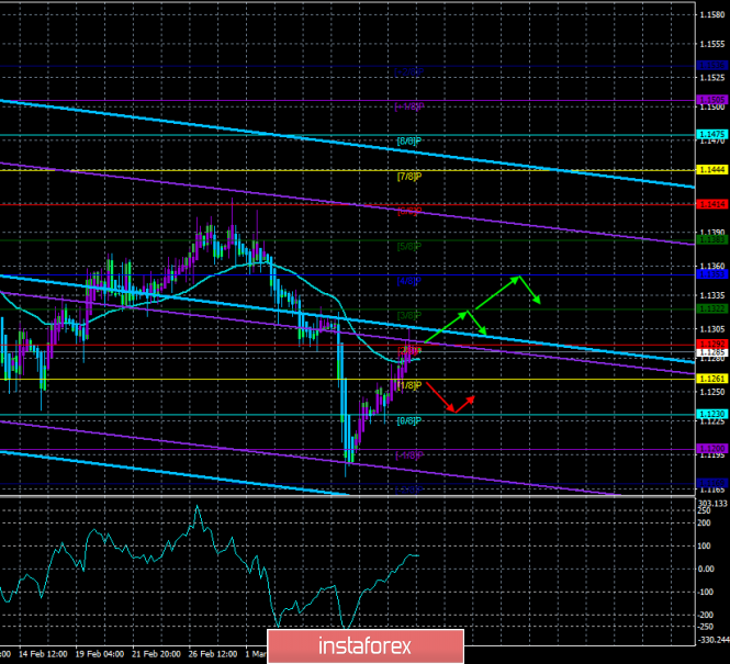 Валютная пара EUR/USD в среду, 13 марта, продолжает несильное, но практически безоткатное, восходящее движение и преодолела мувинг. Как мы уже говорили несколько раз на этой неделе, все внимание участников рынка по-прежнему приковано к фунту стерлингов, а точнее к событиям, проходящим в Британском парламенте. По евро же торги вялые и неактивные. Вчера в Штатах были опубликованы отчеты по инфляции, но даже они особого влияния на пару не оказали, хотя, возможно, и помогли ей еще немного подрасти. Сегодня в Евросоюзе будет опубликован второстепенный отчет по промышленному производству за январь. А в Штатах выйдет сразу несколько отчетов по заказам на товары длительного и капитального использования. Американские отчеты имеют большую степень значимости, поэтому основные движения могут протекать на американской торговой сессии. Какого рода движения будут, станет ясно после выхода этих отчетов. Евровалюты в последние несколько дней восстановилась после преодоления важнейшей области 1,1250 – 1,1290, но в целом нисходящая тенденция по инструменту сохраняется, несмотря на преодоление мувинга. У евро, как и прежде, нет весомой фоновой поддержки, вроде сильной монетарной политики или «ястребиного» настроя ЕЦБ, которые бы нивелировали менее важные разочаровывающие новости.
