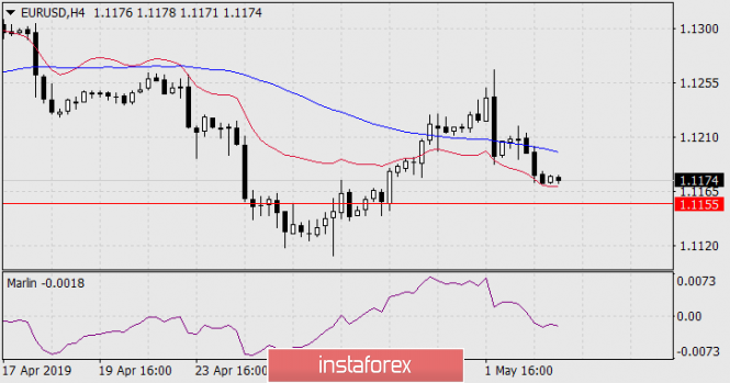 В четверг доллар усилился, прибавив по индексу 0,2%, чему способствовали хорошие данные по росту фабричных заказов – мартовский показатель подрос на 1,9% против ожидания 1,0%. Евро потерял 22 пункта, получив в итоге поддержку со стороны линии баланса четырёхчасового масштаба. Осциллятор марлин на Н4 указывает на дальнейшее понижение тенденции.