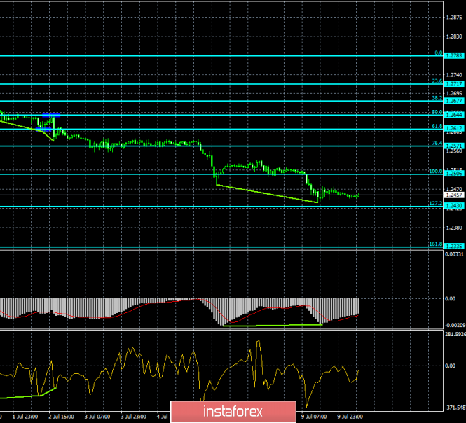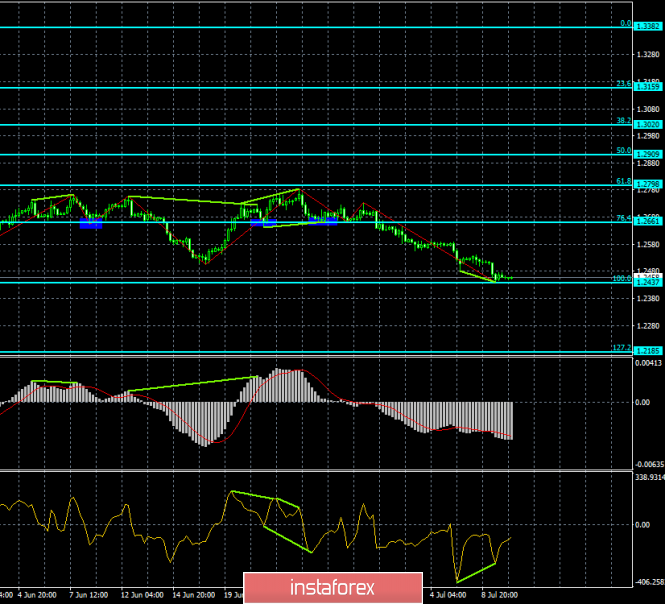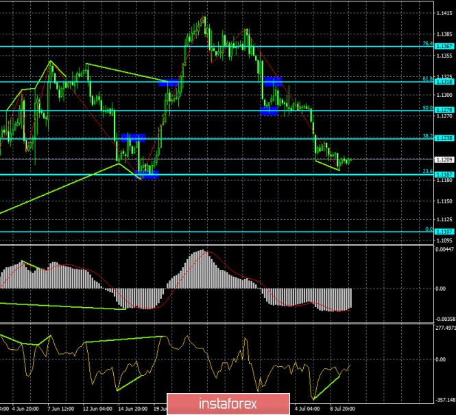 Пара EUR/USD на 4-часовом графике продолжает процесс падения в направлении коррекционного уровня 23,6% - 1,1187. Образование бычьей дивергенции у индикатора CCI позволяет трейдерам ожидать разворот в пользу европейской валюты и некоторый рост в направлении уровня коррекции 38,2% - 1,1238. Отбой котировок от уровня Фибо 23,6% аналогично сработает в пользу начала роста пары евро-доллар. Тем временем, трейдеры продолжают ожидать начала выступления председателя ФРС Джерома Пауэлла в Конгрессе. Это событие, безусловно, самое важное на этой неделе. Выступлений будет два и трейдеры надеются получить информацию, которая все же прольет свет на вопрос, действительно ли ФРС намерена снизить ключевую ставку в ближайшие месяцы? Или же это была реакция на слабые экономические показатели в июне? Сейчас, на фоне сильных нонфармов Джером Пауэлл может ужесточить свою риторику, что рынок форекс расценит, как сигнал к отмене желания снизить ставку. Так или иначе, сегодня и завтра мы узнаем, какого настроя придерживается Пауэлл. Кстати, отсутствие каких-либо изменений в формулировках и риторике Пауэлла или же вовсе игнорирование темы монетарной политики(что маловероятно), тоже будет иметь важное значение. Это будет означать, что в намерениях ФРС ничего не изменилось.