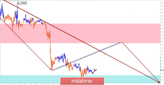 Пояснения к рисункам: Волны в упрощенном волновом анализе состоят из 3 частей (А-В-С). Анализируется последняя, незавершенная волна. Зоны показывают участки с наибольшей вероятностью разворота. Стрелками указана волновая разметка по используемой автором методике, сплошным фоном сформированная структура, пунктирным - ожидаемые движения.