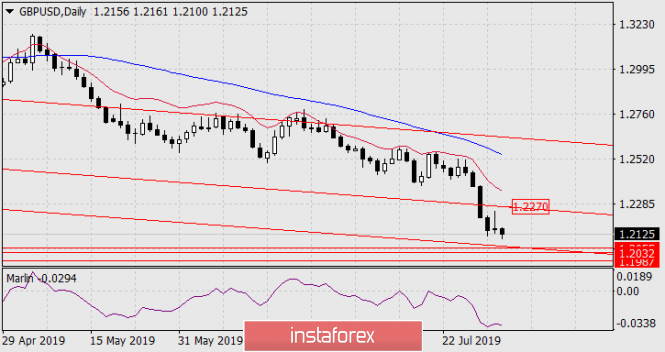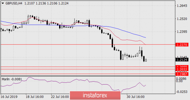 Британский фунт вчера закрыл день ростом на 8 пунктов благодаря росту на 100 пунктов в первой половине дня. Цене немного не дотянула до сопротивления ценового канала 1.2270 и развернулась вниз с открытия американской сессии. Ставку FOMC ФРС понизил с 2,50% до 2,25%, но Джером Пауэлл заявил, что дальнейшие шаги будут полностью зависеть от поступающих данных, чем и посеял сомнения инвесторов в сентябрьском понижении.