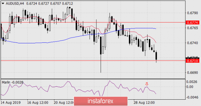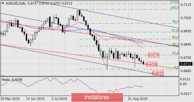 За четыре дня снижения австралийский доллар прошёл небольшой путь от уровня Фибоначчи 23,6% на дневном графике до поддержки вложенной линии красного ценового канала месячного масштаба (0.6710). Первая попытка рынка преодолеть эту поддержку была 7 августа, но она была на выдыхающемся двухнедельном движении, вторая попытка была 26 августа, теперь третья попытка, которая статистически в 80% оказывается удачной. Осциллятор Марлин на daily слабо понижается, есть задел для среднесрочного снижения. Первой же целью выступает поддержка синего ценового канала в районе 0.6650.