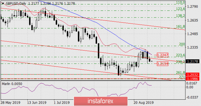 В четверг, после касания ценой уровня Фибоначчи 223,6% фунт стерлингов развернулся на понижение, потеряв 28 пунктов. На дневном графике цена закрепилась под трендовой линией ценового канала, приблизившись к уровню Фибоначчи 238,2% (1.2154). Уход цены под уровень открывает цель 261,8% Фибоначчи на цене 1.2032. За ним уровень 271,0% на цене 1.1986, причём в районе совпадения с линией ценового канала.
