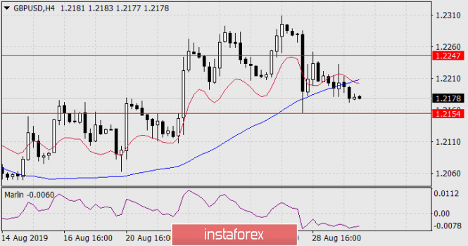 На четырёхчасовом графике цена закрепилась под индикаторными линиями баланса и Крузенштерна, Марлин на отрицательной территории, ждём реализацию понижающегося сценария. Помочь такому развитию могут сегодняшние данные по США, где личные доходы потребителей за июль ожидаются ростом на 0,3%, личные расходы на 0,5%, индекс деловой активности в производственном секторе региона Чикаго за август прогнозируется ростом с 44,4 до 48,1.