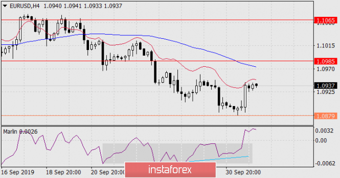 На четырёхчасовом графике повышающийся момент выражен сильно; сигнальная линия осциллятора Марлин отработала конвергенцию с переходом в зону роста и вышла вверх из диапазона, отмеченного в окне серым цветом. Но этим показывается и кратковременность движения – линия Марлина отрисовалась вертикально вверх, скоро достигнет зоны перекупленности, что и предуказывает на вероятное восстановление понижающегося тренда.