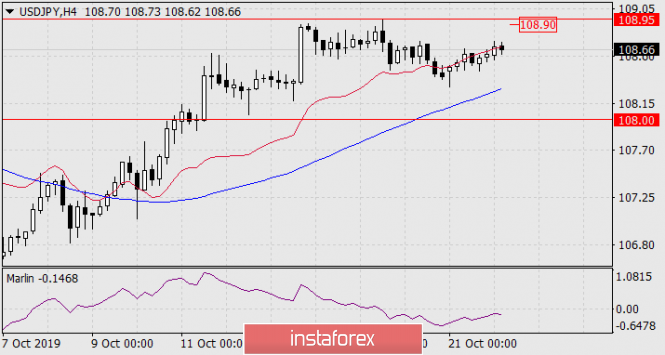 На четырёхчасовом графике осциллятор Марлин сохраняется в зоне отрицательных чисел. Здесь тоже преодоление ценой 108.90/95 автоматически переведёт индикатор в зорну роста. Таким образом, всё внимание на данный ценовой уровень – его преодоление открывает цель 109.73. Если доллар не выполнит эту задачу, то может упасть к 108.00 – к поддержке красного ценового канала на daily.