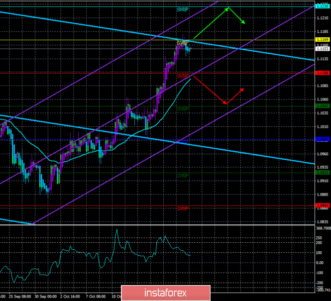 Второй торговый день недели вряд ли чем-то будет кардинально отличаться от первого. Валютная пара EUR/USD начала корректироватся, не сумев преодолеть уровень Мюррея «7/8» - 1,1169, таким образом, в ближайшее время можно ожидать снижения к скользящей средней линии и уровню Мюррея «6/8». Макроэкономических событий и данных в понедельник, 21 октября, не было никаких, и точно такая же картина будет и сегодня. Таким образом, трейдеры могут рассчитывать во вторник лишь на технические факторы и на Brexit, который в последнее время оказывает воздействие на поведение пары евро/доллар.