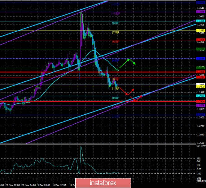 Средняя волатильность пары фунт/доллар за последние 5 дней составляет 132 пункта, оставаясь на высоком уровне. Однако среди этих 5 дней есть дни в которые волатильность была аномально высокой, поэтому мы берем сейчас показатели средней волатильности за 30 дней, и согласно этому рабочий канал волатильности на 23 декабря ограничен уровнями 1,2904 и 1,3096. Все «быстрые» технические индикаторы продолжают указывать на движение вниз, таким образом, краткосрочная нисходящая тенденция сохраняется. Каналы линейной регрессии могут начать разворачиваться вниз в ближайшее время.