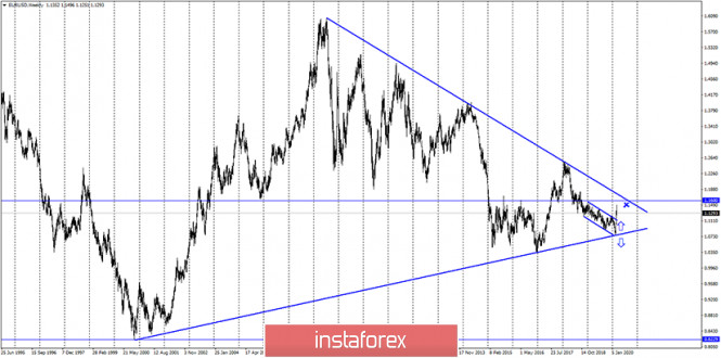 Недельный график указывает на то, что потенциал для роста у валюты ЕС остается и ограничен уровнем 1,1600 (приблизительно) или верхней линией сужающегося треугольника. Пока что трейдеры-быки решили взять паузу (неизвестно, надолго ли), таким образом, цель сохраняет свою актуальность, но ее отработка может быть отложена на некоторое время.
