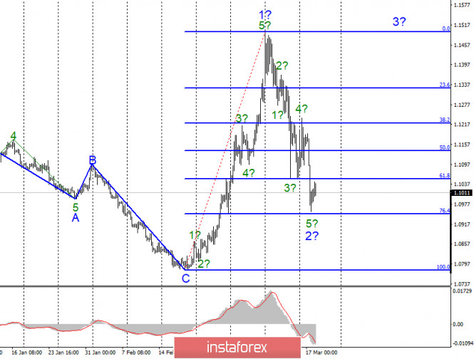 17 марта пара EUR/USD потеряла 170 базовых пунктов и продолжила, таким образом, построение понижательной волны, предположительно 2. Если это предположение верно, то весь участок тренда, берущий начало 20 февраля, может значительно усложниться. Волна 2 также может принять более протяженный и сложный вид, так как сейчас внутри нее прослеживается 5 волн. Однако эта волна коррекционная и не может иметь более 3 волн, учитывая ее «стандартность». Таким образом, скорее всего, она примет еще более сложный вид, а котировки инструмента могут снизиться вплоть до минимума волны 1.