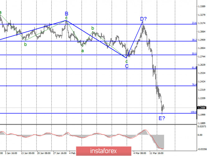 Пара GBP/USD 17 марта потеряла еще более 200 базовых пунктов, таким образом, предполагаемая нисходящая волна E продолжает свое построение и приобретает весьма протяженный вид. Однако ничего с этим не поделаешь. Рынки продолжают оставаться в состоянии паники. Британец валится вниз уже 6 полных дней подряд, а суммарные потери составляют уже порядка 1000 базовых пунктов. Неудачная попытка прорыва уровня 100,0% может привести не только к отходу котировок от достигнутых минимумов, но и к завершению построения волны E и всего нисходящего участка тренда.