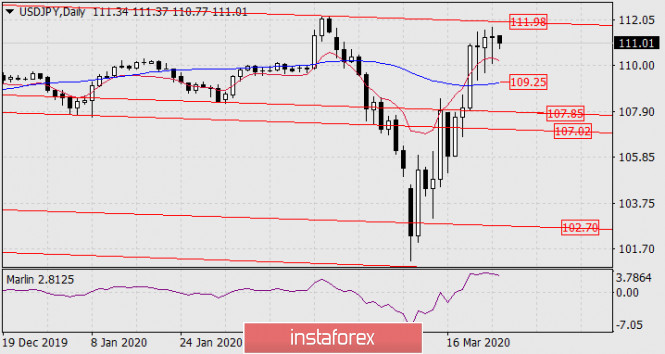 Вчера пара USD/JPY ещё раз попыталась отработать сопротивление вложенной линии ценового канала на 111.98. Попытка не удалась, и сегодня техническое давление на пару стало ещё больше, поэтому разворот может состояться сегодня. Сигнальная линия осциллятора Марлин на графике дневного масштаба разворачивается вниз, что и показывает техническое давление. Первой целью снижения выступает линия Крузенштерна на цене 109.25, преодоление поддержки открывает целевой диапазон 107.02/85 – диапазон двух вложенных линий нисходящего ценового канала.