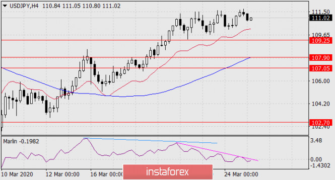 На графике четырёхчасового масштаба после формирования двойной сложной дивергенции по осциллятору Марлин его сигнальная линия внедрилась в зону отрицательной тенденции. Ждём развитие нового нисходящего движения.