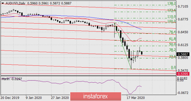 В среду австралийский доллар подрастал в моменте на 108 пунктов, но день был закрыт снижением на 10 пунктов. Цена развернулась от уровня коррекции 50,0%, всего несколько пунктов не дотянув до него. Но с сегодняшним продолжением снижения «австралийца» разворот можно считать состоявшимся. Индикатор Марлин также разворачивается вниз. Целью снижения выступает пик августа 2001 года на цене 0.5395.