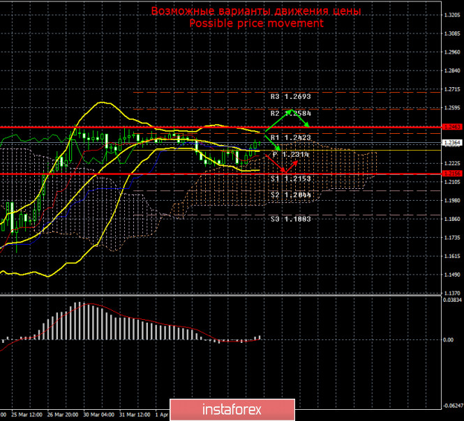Валютная пара GBP/USD 7 апреля также начала виток восходящего движения, однако в этом случае движение вверх протекает внутри бокового канала. По фунту стерлингов сейчас наблюдается флэт, а уровни волатильности на 7 апреля как нельзя лучше показывают границы этого бокового канала. Таким образом, до тех пор пока котировки пары не покинут этот канал, который на данный момент можно ограничить уровнями 1,2200 и 1,2450, речи о возобновлении трендового движения не идет. Волатильность пары фунт/доллар остается достаточно высокой. Последний средний показатель равняется 157 пунктам, за сегодняшний день пара прошла уже 220. Таким образом, так же как и в случае с евровалютой, рынки вновь начинают если не паниковать, то вести себя очень агрессивно. Поэтому в ближайшее время возможна «вторая волна» паники, но зависеть она будет от множества фундаментальных факторов. Например, от дальнейшего распространения коронавируса в Евросоюзе, Великобритании и Штатах, от разработки вакцин против вируса, от продления карантинных мер во всех вышеперечисленных странах, от стоимости нефти, от новых возможных падений фондовых индексов.