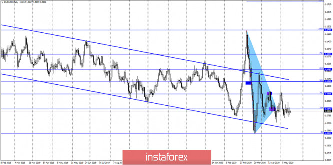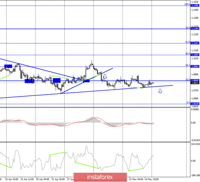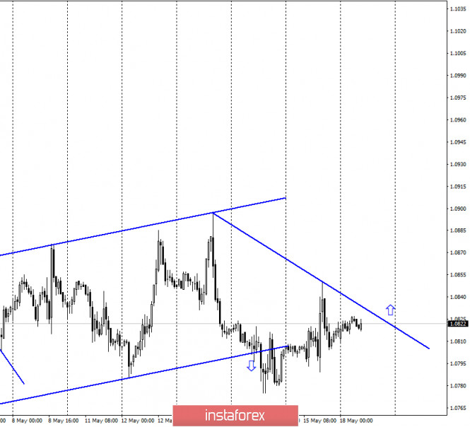 Добрый день, уважаемые трейдеры! Пара EUR/USD 15 мая на часовом графике выполнила разворот в пользу европейской валюты и начала новый процесс роста. Однако при этом мне удалось построить новую нисходящую линию тренда, которая определяет текущее настроение трейдеров как «медвежье», и при этом же котировки пары только недавно покинули восходящий трендовый коридор. Таким образом, ситуация крайне запутанная. Ключевой темой на рынках сейчас остается тема возможного нового конфликта между Америкой и Китаем. Эта тема имеет под собой множество различных аспектов, поэтому совершенно невозможно предположить, чем все может завершиться. Ходят слухи, что Китай может отказаться от первой фазы сделки, которая была заключена в январе, ссылаясь на непредвиденные события (эпидемия коронавируса). Ходят слухи, что Дональд Трамп собирается ввести новые пошлины и санкции против Китая, его официальных лиц и компаний в качестве ответа за распространение коронавируса. Но при этом любые штрафы, санкции и пошлины будут продублированы и второй стороной. Таким образом, обе экономики могут начать страдать от нового противостояния между странами. А сейчас явно не лучшее время для дополнительного давления на экономику.