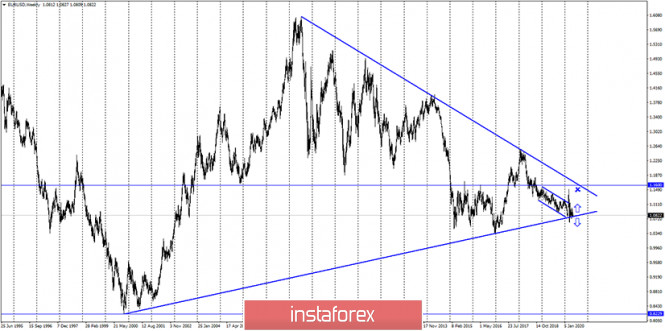 На недельном графике пара EUR/USD продолжает торговаться недалеко от нижней линии «сужающегося треугольника». Отбой котировок от этой линии по-прежнему позволяет рассчитывать на некоторый рост в долгосрочной перспективе в направлении уровня 1,1600 (верхняя линия «треугольника»). Закрытие пары под «треугольником» сработает в пользу валюты США и нового, возможно, длительного падения.