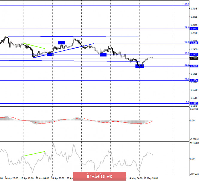 На 4-часовом графике пара GBP/USD выполнила отбой от уровня коррекции 38,2% - 1,2095, разворот в пользу британца и рост к коррекционному уровню 50,0% - 1,2303. Отбой котировок от этого уровня Фибо сработает в пользу американской валюты и возобновления падения котировок в направлении уровня 38,2%. Назревающих дивергенций сегодня нет ни у одного индикатора. Закрытие курса пары над уровнем Фибо 50,0% повысит вероятность дальнейшего роста в направлении следующего уровня коррекции 61,8% - 1,2516.