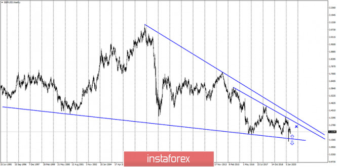 На недельном графике пара фунт-доллар выполнила ложный пробой нижней линии тренда. Таким образом, до закрепления котировок пары под этой линией сохраняется высокая вероятность роста в направлении двух верхних линий тренда, но в долгосрочной перспективе.