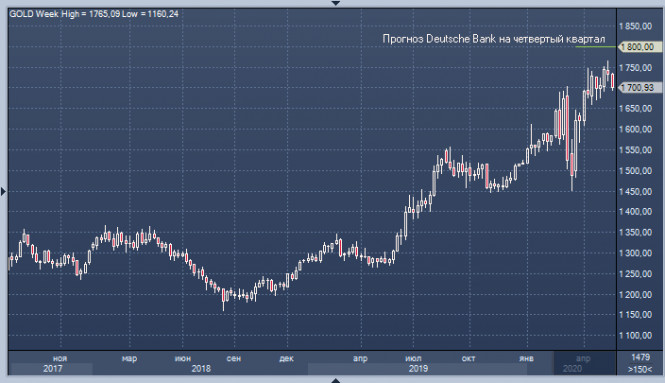 Растущий спрос на основной драгметалл способствует благоприятным прогнозам аналитиков. Ведущие эксперты крупнейших инвестиционных банков, таких как Goldman Sachs и Bank of America, единодушно предвещают рост цен на золото до $2000–$3000 за 1 унцию. Согласно прогнозам аналитиков, заметное удорожание золота произойдет в ближайшие два года. Что касается прогноза Deutsche Bank, то в четвертом квартале 2020 года стратеги банка ожидают роста цены драгметалла до $1800 за 1 тройскую унцию.
