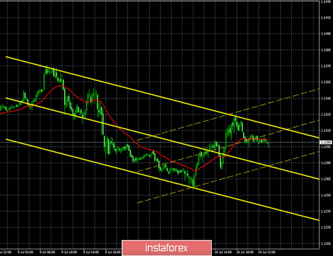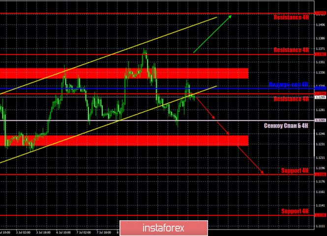 На часовом таймфрейме 10 июля покупатели торговали пару с одной стороны странно, а с другой - достаточно технично. Первое, что мы хотели бы отметить, покупателям так и не удалось пробиться сквозь область сопротивления 1,1326 – 1,1342, а также через уровень сопротивления 1,1362. Напоминаем, что пара евро/доллар остается в боковом канале, ограниченном уровнями 1,1350 и 1,1200. Таким образом, вполне можно сделать вывод о том, что преодолеть верхнюю границу этого канала трейдерам не удалось. Второе – котировки пары закрепились ниже восходящего канала, таким образом, на часовом графике тенденция поменялась на нисходящую. Вместе с тем в пятницу продавцам не удалось продавить линию Сенкоу Спан Б, поэтому начался коррекционный рост, возможно, в рамках уже новой нисходящей тенденции, который был прерван около еще одной важной линии индикатора Ишимоку – Киджун-сен. Таким образом, весь последний торговый день недели пара торговалась между важными линиями индикатора Ишимоку. В текущих условиях мы ждем возобновления нисходящего движения. Однако при этом ниже уровня 1,1200 в ближайшее время медведям пробиться будет достаточно сложно.