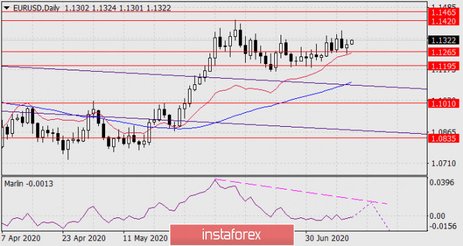 Пятничный день закрылся ростом евро. Цена нашла сильную поддержку на уровне 1.1265. Сегодня утром рост продолжается, осциллятор Марлин спешит переместиться в зону роста – в верхнюю половину собственного окна. Вариант с дивергенцией, при котором евро покажет новый максимум (1.1465), приобретает всё большую силу.