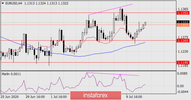 На четырёхчасовом графике цена преодолевает сигнальный уровень 1.1315, осциллятор Марлин переместился в зону растущей тенденции, ближайшей целью роста становится уровень 1.1353. Преодоление уровня открывает дорогу к 1.1420, затем к 1.1465. Недавно образованная дивергенция теперь считается отработанной, цена взяла курс на новый краткосрочный тренд.