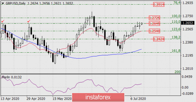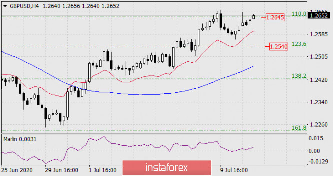 На четырёхчасовом графике сигнальная линия осциллятора Марлин развернулась от границы с территорией снижения. Здесь (на данном масштабе) также наблюдается повышенный интерес рынка к росту фунта. Ждём закрепление над уровнем Фибоначчи 110,0% и рост цены к уровню Фибоначчи 100,0% на цене 1.2725.