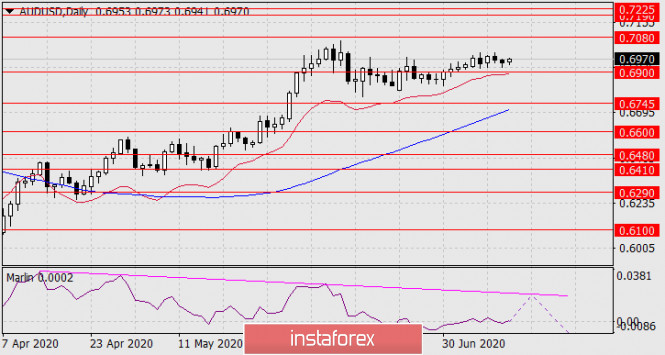Для развития нисходящего и альтернативного сценария цене сначала нужно закрепиться под линией Крузенштерна на отметке 0.6930, затем уйти под целевой уровень 0.6900.