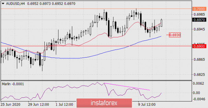 На графике четырёхчасового масштаба цена удерживается в росте сопротивлением индикаторной линии баланса. Усиление цены возможно после выхода сигнальной линии осциллятора Марлин в зону положительных значений. Ориентировочно это может произойти при достижении «австралийцем» цены 0.6975. Дивергенция по осциллятору в этом случае окажется отработанной и потерявшей силу. Более решительное намерение цены к штурму 0.7080 появится с преодолением сигнального уровня 0.7000.